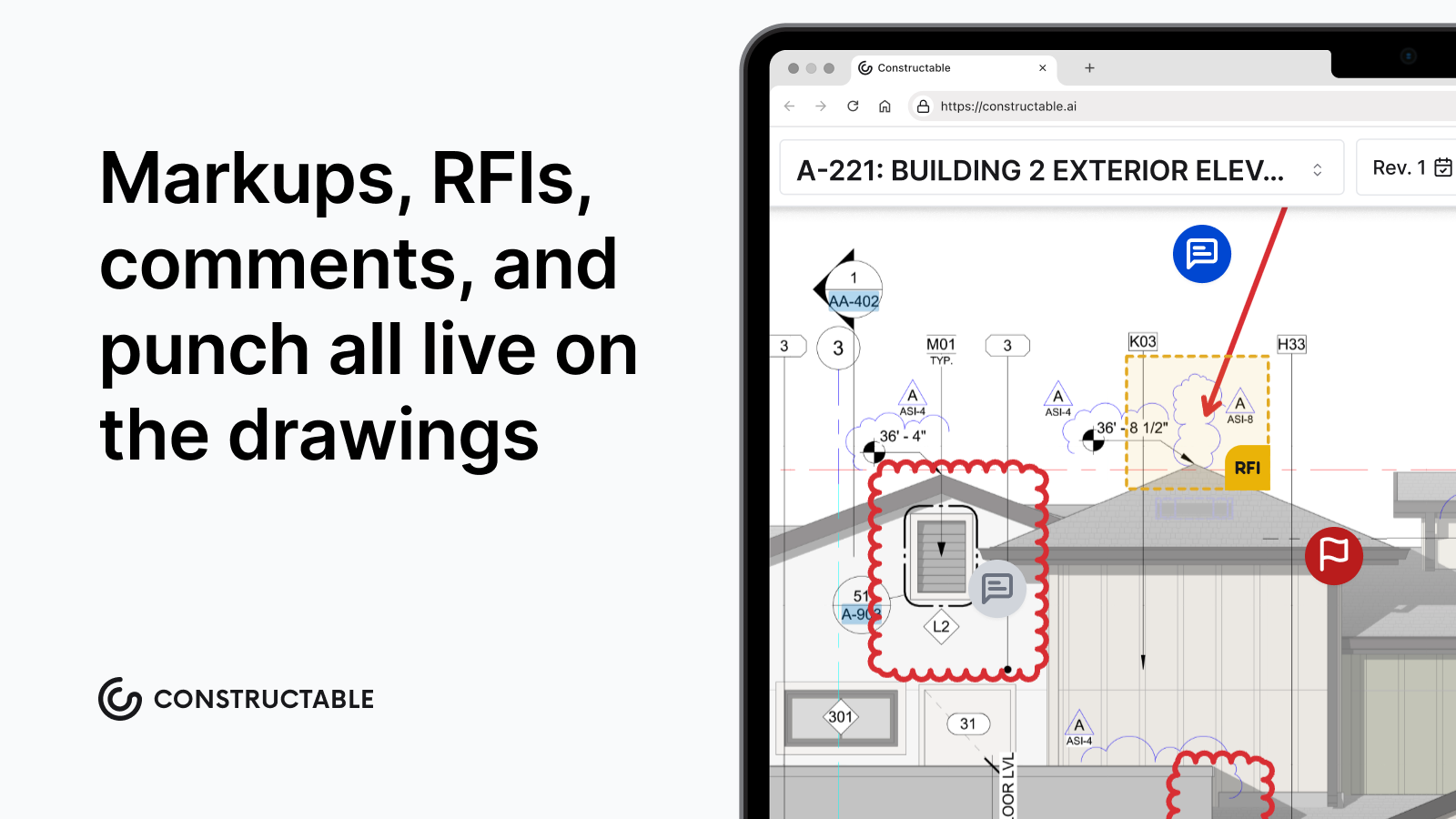 - Drawings-first collaboration with direct markup and RFI pinning on plans