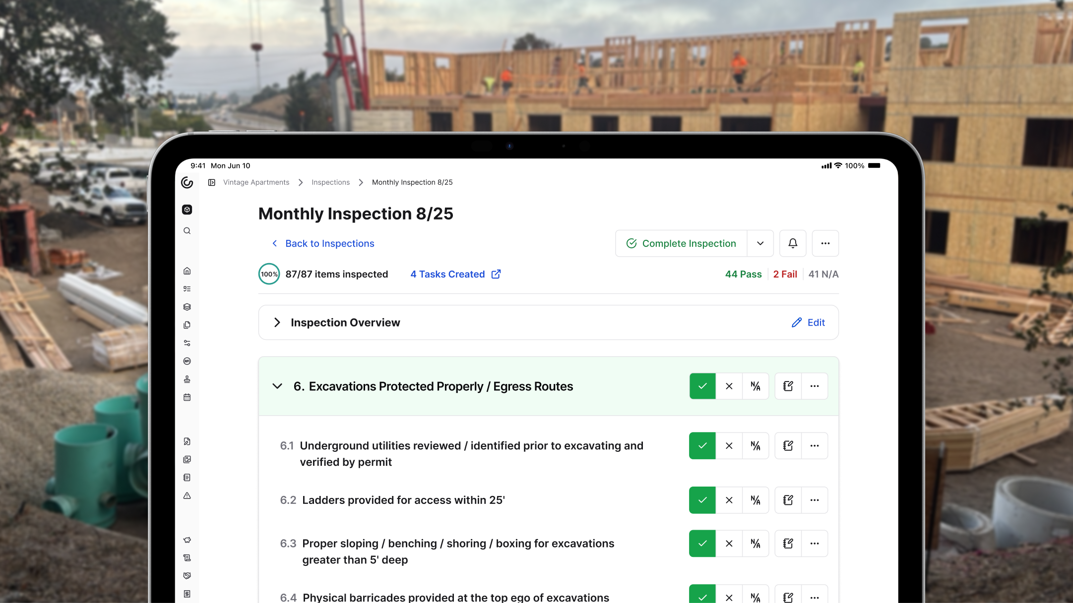 Yes. Constructable's Inspections tool, available in Field Tools, lets you build custom checklists, run internal field reviews, and track pass/fail results before official inspections. No add-ons or point solutions needed: just draft your sections and items, walk the work, and document what you find.