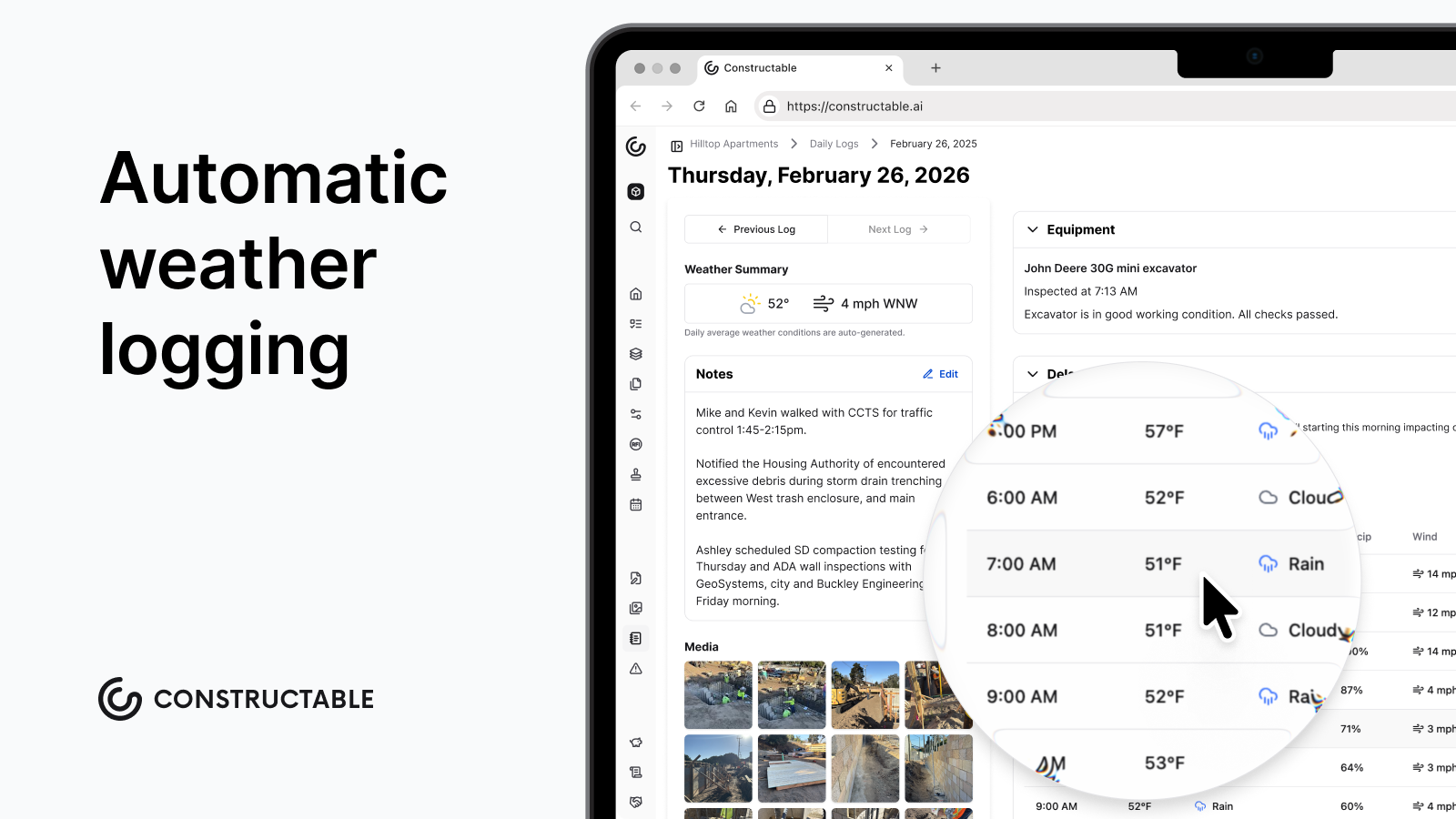 Constructable makes daily logs fast and automatic. Weather data pulls in every hour using your project's zip code. No manual entry. No guessing. You get temperature, conditions, precipitation, and wind speed without lifting a finger.
