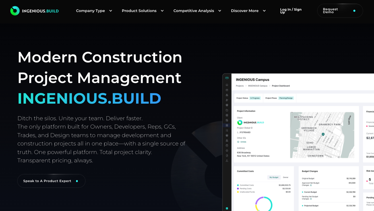 INGENIOUS.BUILD is a construction management system that emphasizes financial controls and owner-side reporting. The product structures workflows around financial oversight and multi-project portfolio management rather than day-to-day GC execution.